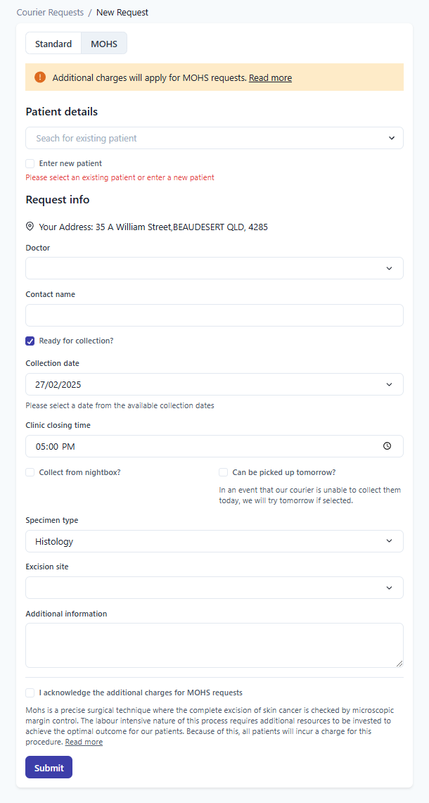 - Acknowledge Additional Charges: Check the box to accept any extra fees associated with MOHS requests.
